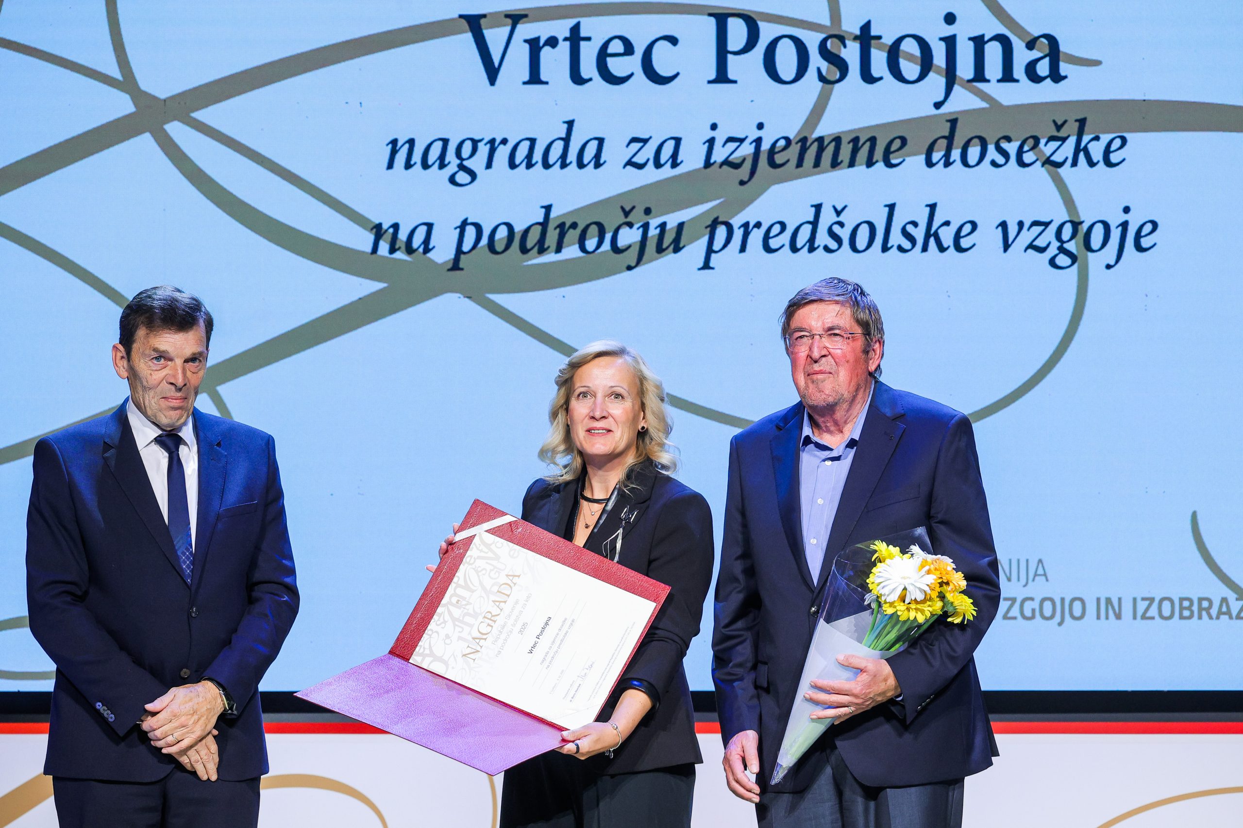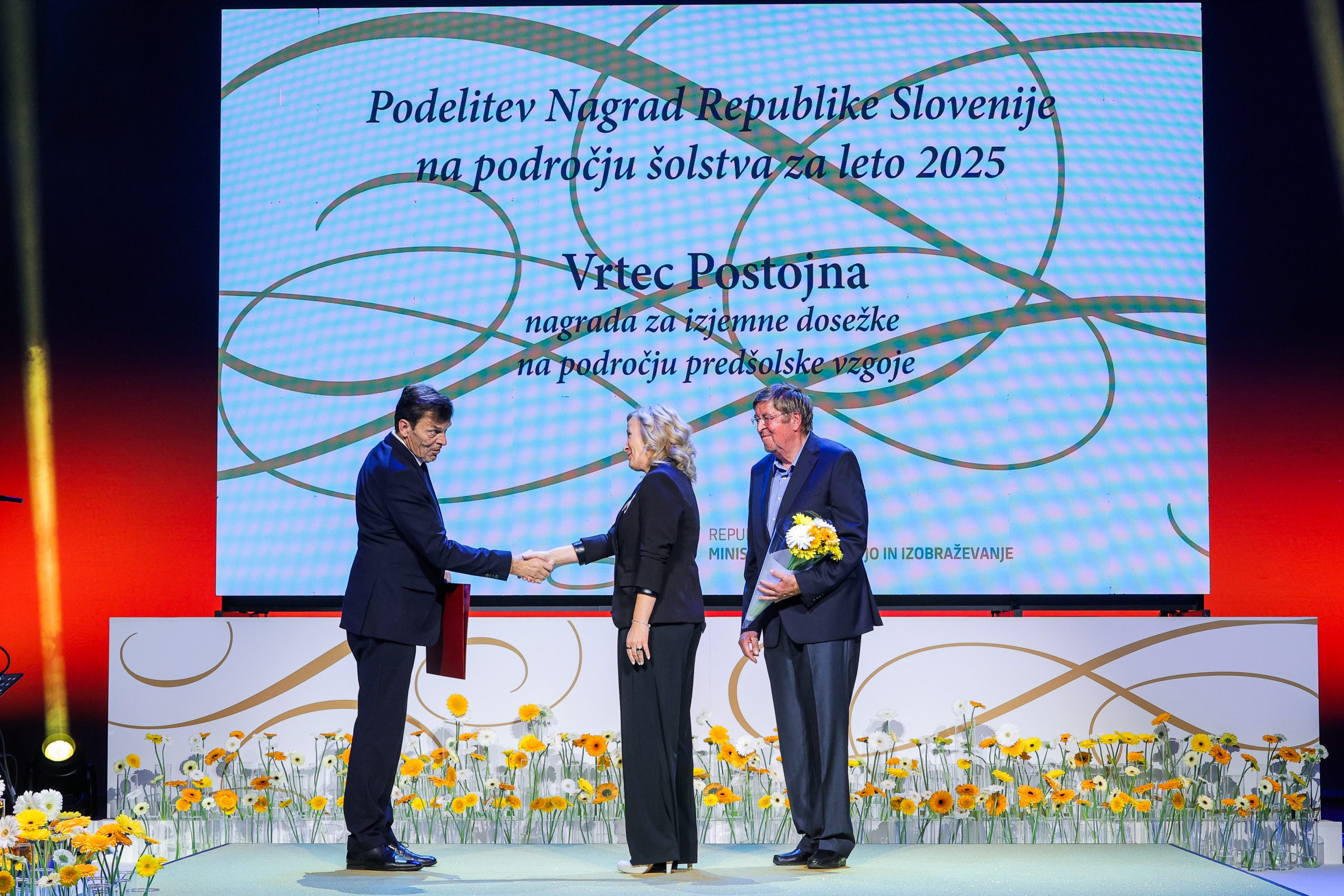 V petek, 3.10.2025, smo zaposleni iz Vrtca Postojna v roke, z veseljem in velikim ponosom, sprejeli državno nagrado za izjemne dosežke na področju predšolske vzgoje, ki jo podeljuje Ministrstvo za vzgojo in izobraževanje Republike Slovenije. Nagrado smo prejeli iz rok Ministra za vzgoji in izobraževanje, dr. Vinka Logaja in predsednika Vlade RS, dr. Roberta Goloba.