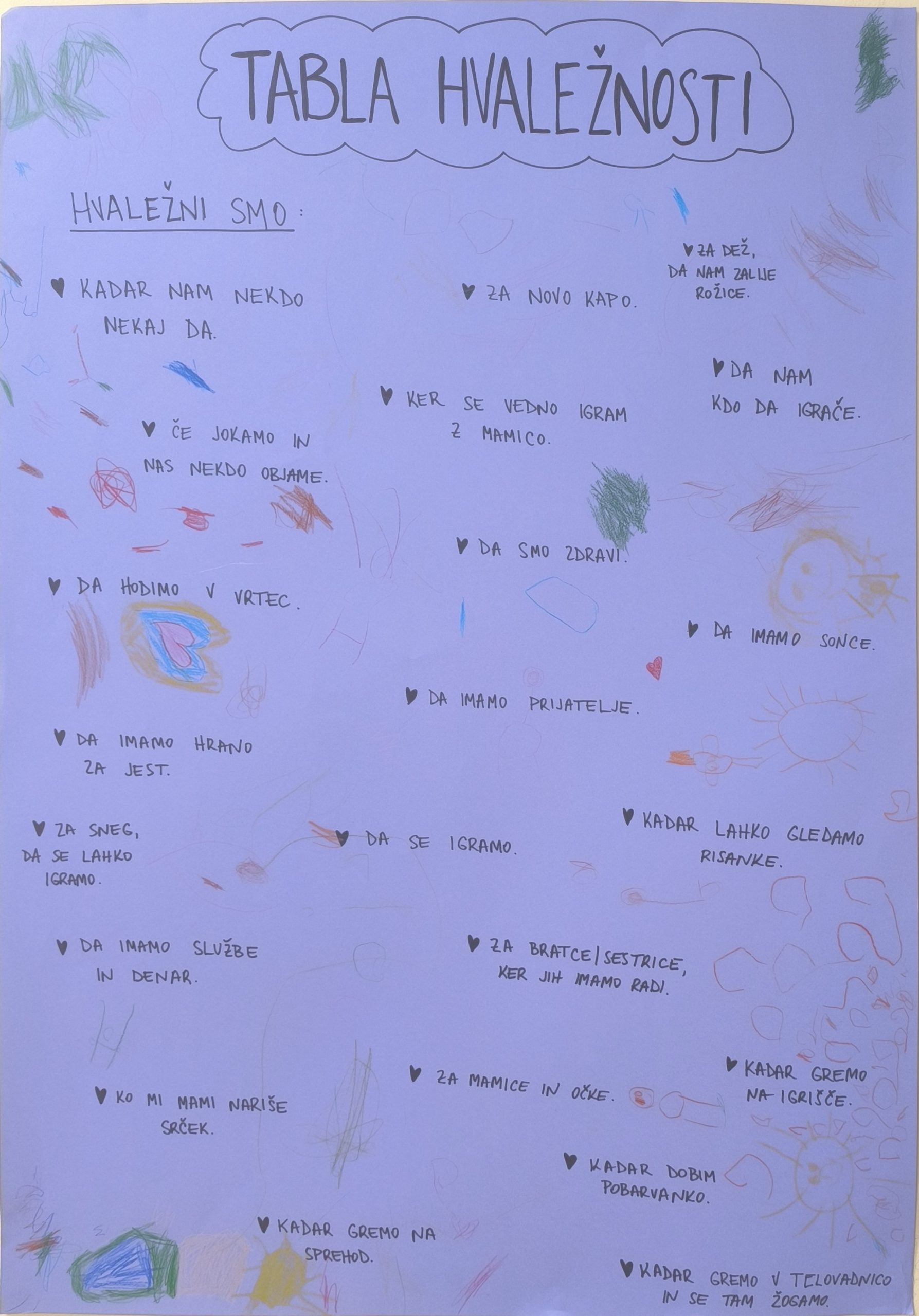 Otroci obeh skupin, so skupaj s pomočjo vzgojiteljic, izdelali plakat, na katerega smo zapisali, za kaj vse smo hvaležni. Na njem najdemo od najmanjših stvari, kot so igrače, do največjih, kot so ljubezen in sonce. Otroci so plakat polepšali s svojimi risbami.