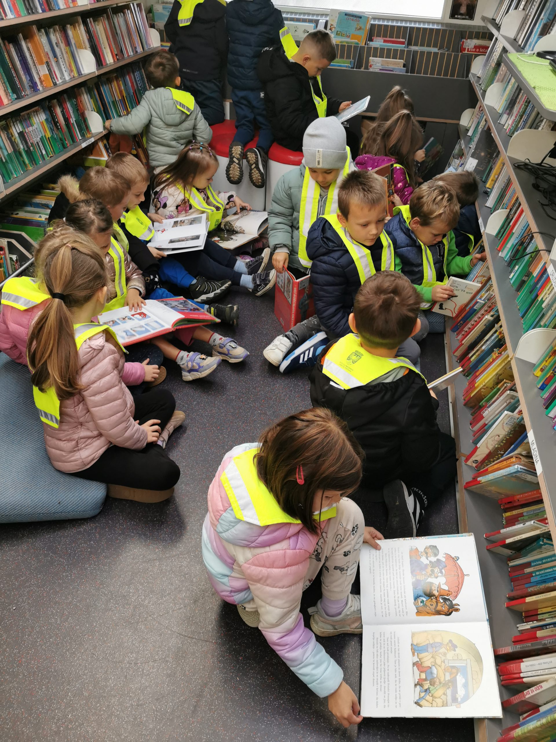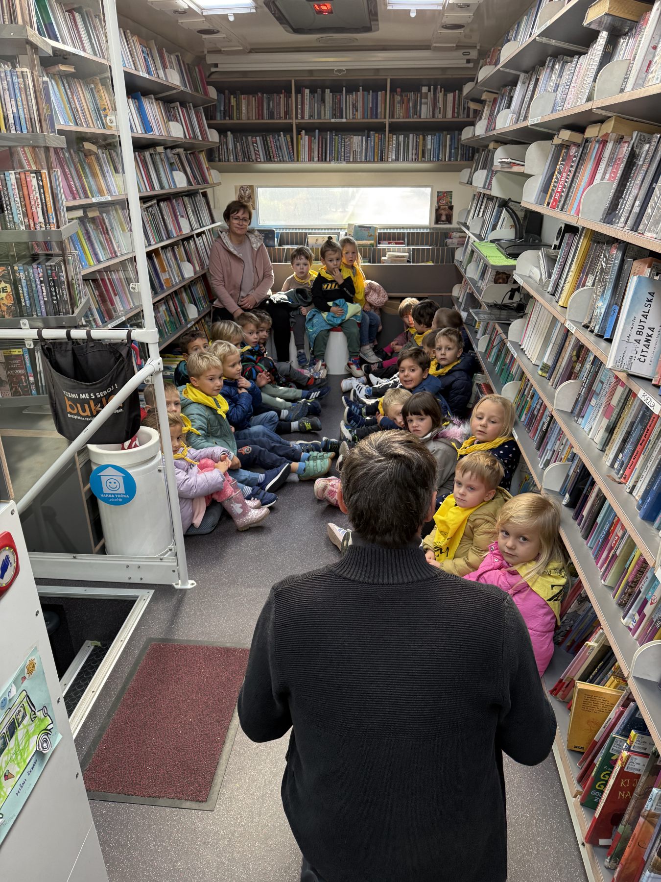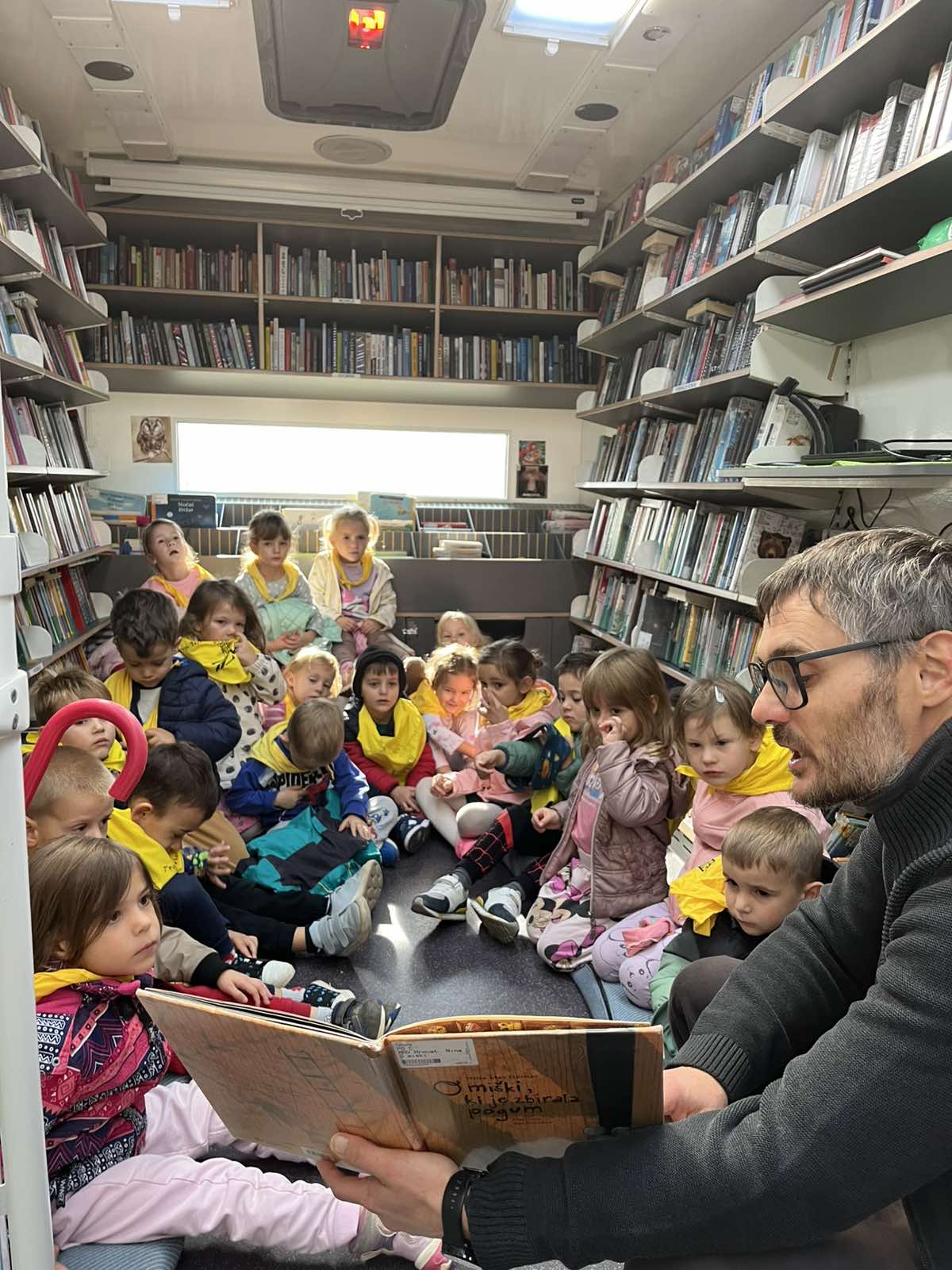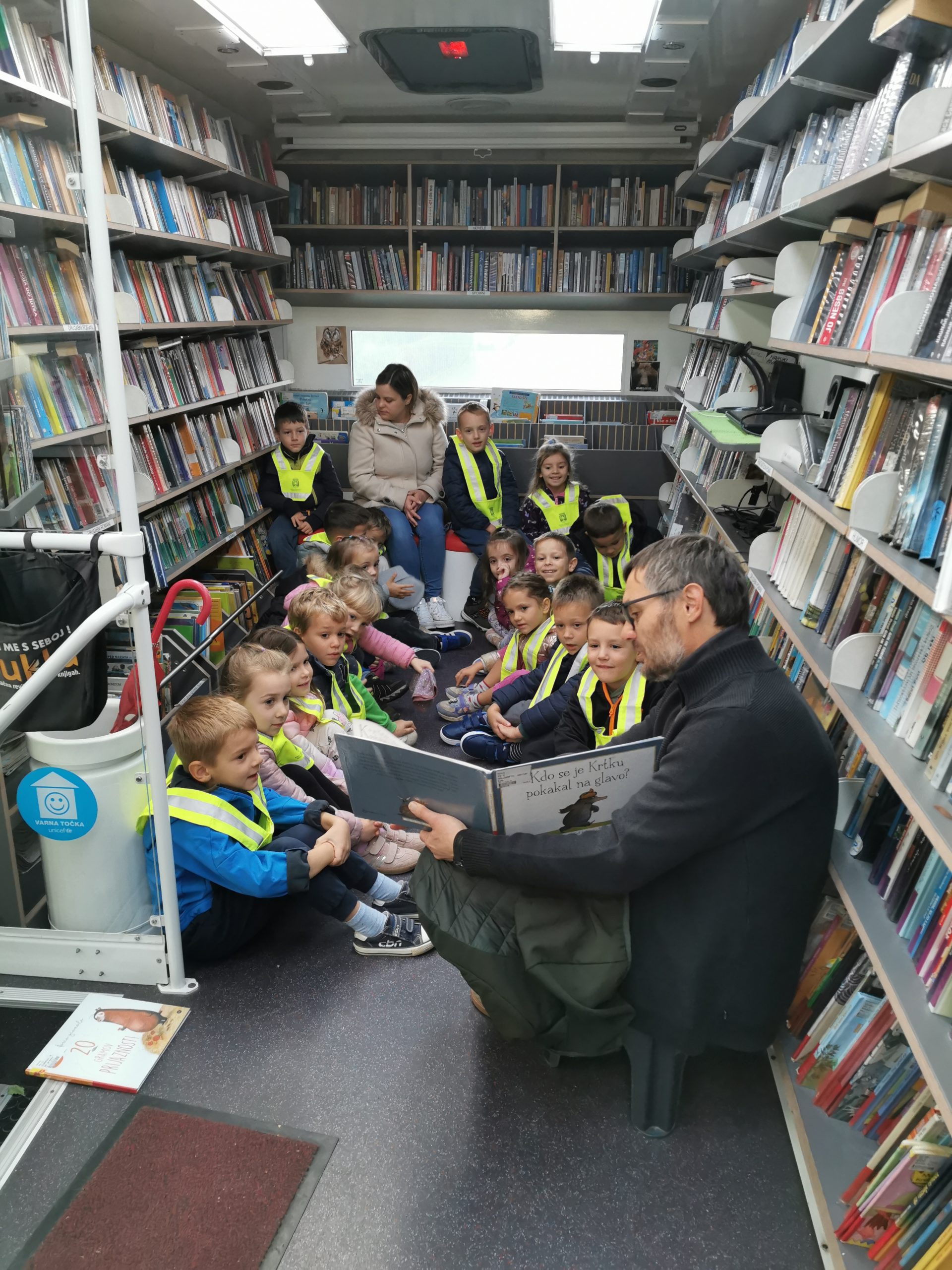 - Poseben dogodek je bil obisk Bibliobusa, kjer nas je knjižničar Nenad A. prijazno sprejel in otrokom predstavil hudomušno pravljico Kdo se je Krtki pokakal na glavo?. Otroci so z zanimanjem raziskovali knjižne police potujoče knjižnice.