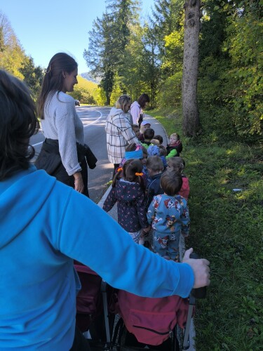 Ker pa imamo v okolici vrtca veliko možnosti za daljše sprehode, smo se ob sončnem in toplem dnevu skupaj odpravili na sprehod. Starejši so pomagali mlajšim pri hoji, jih učili