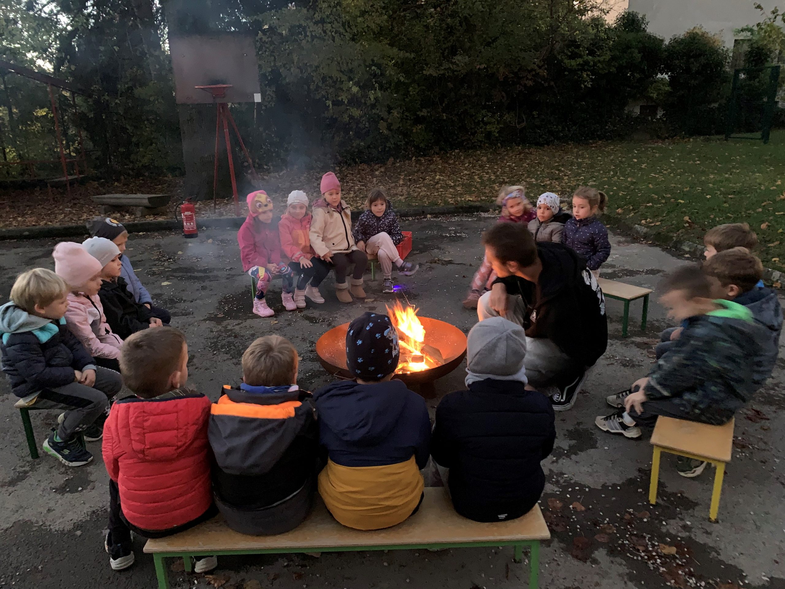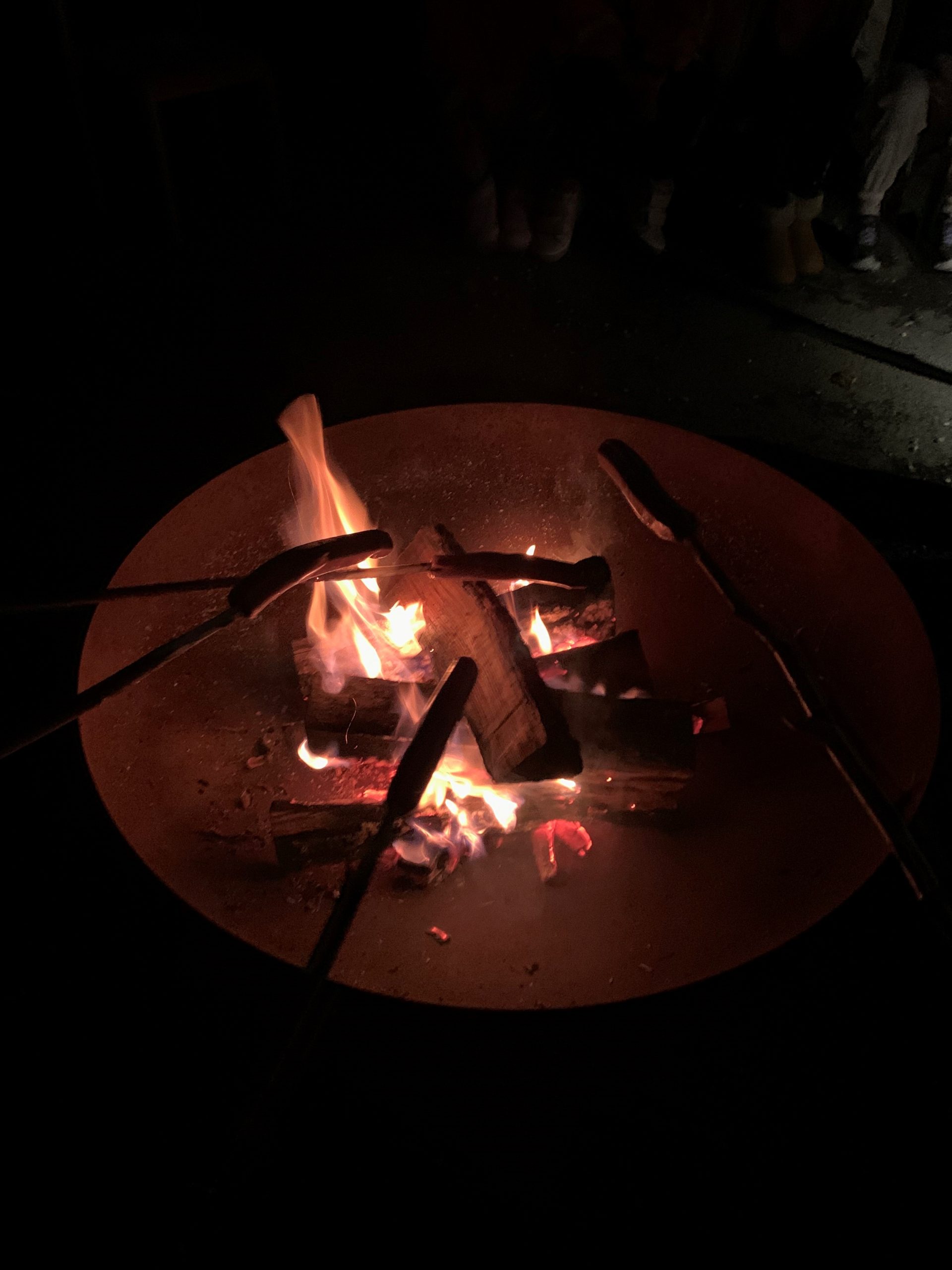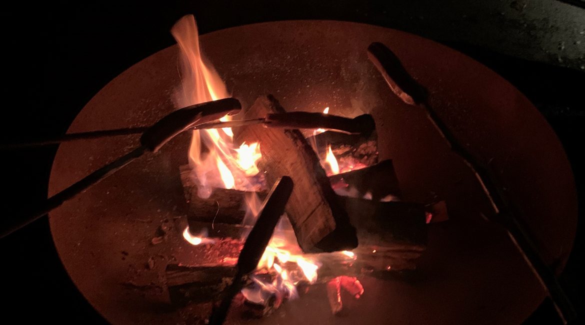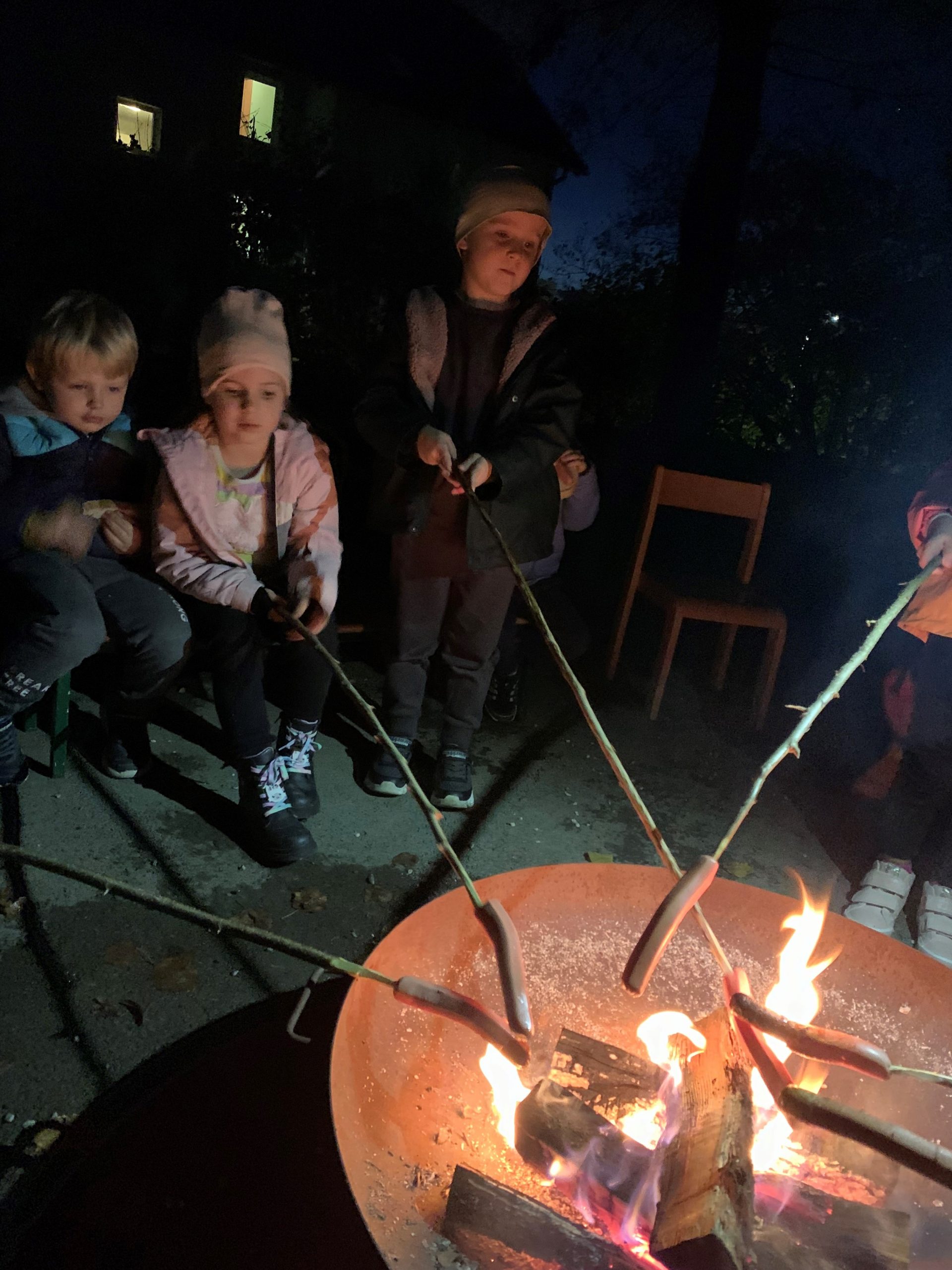 Risi so na igrišču zakurili ogenj in si na palicah pekli hrenovke. S kruhom so bile odlične. Ob pravem taborniškem ognju so prepevali pesmi, opazovali ogenj in polno zvezd na nebu… Pred spanjem so pojedli še košček pice in si ogledali zanimive risanke o palčku Smuku.