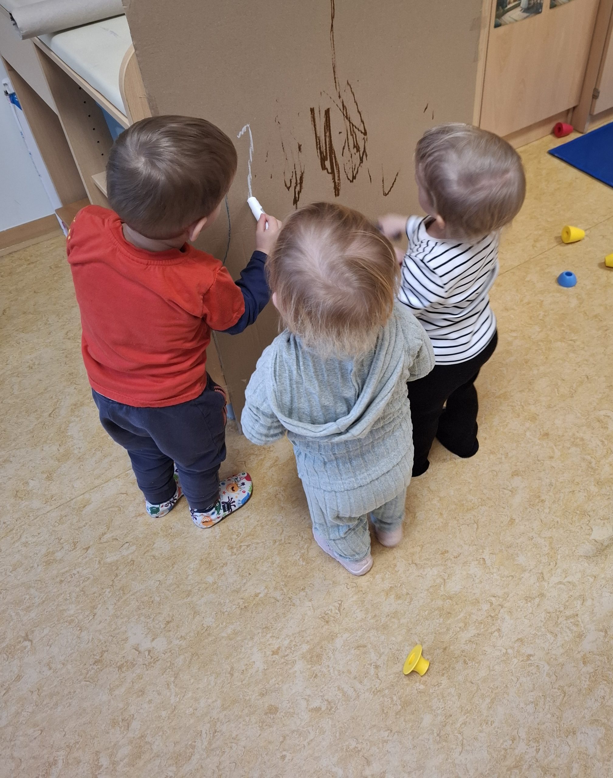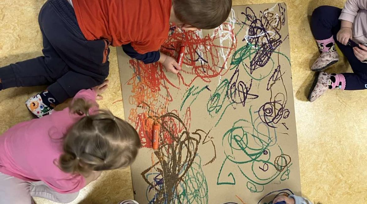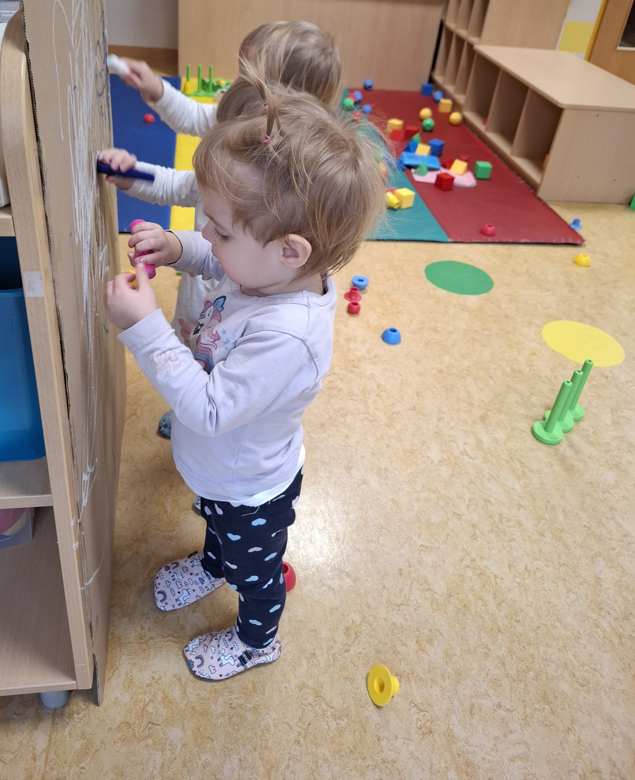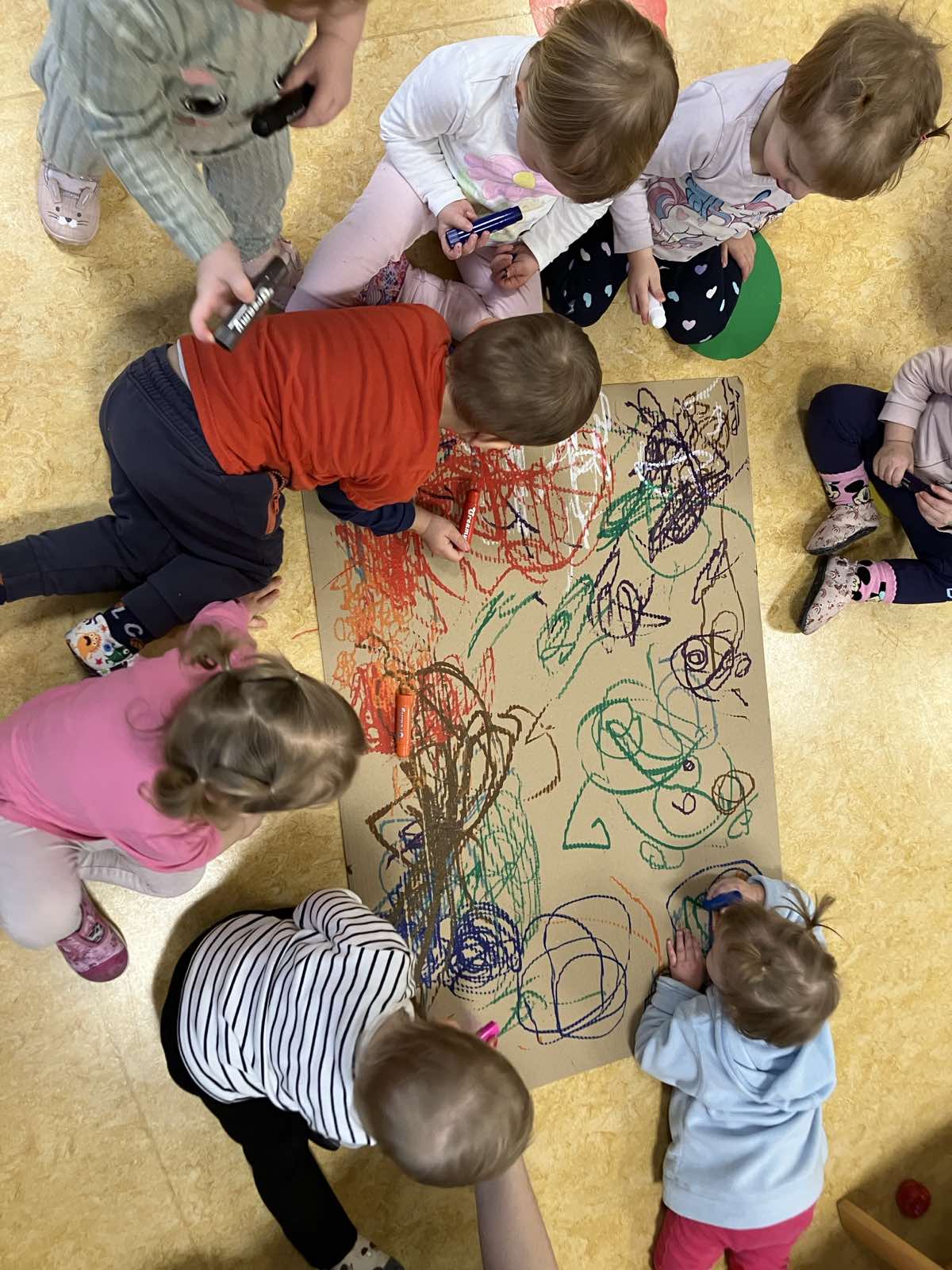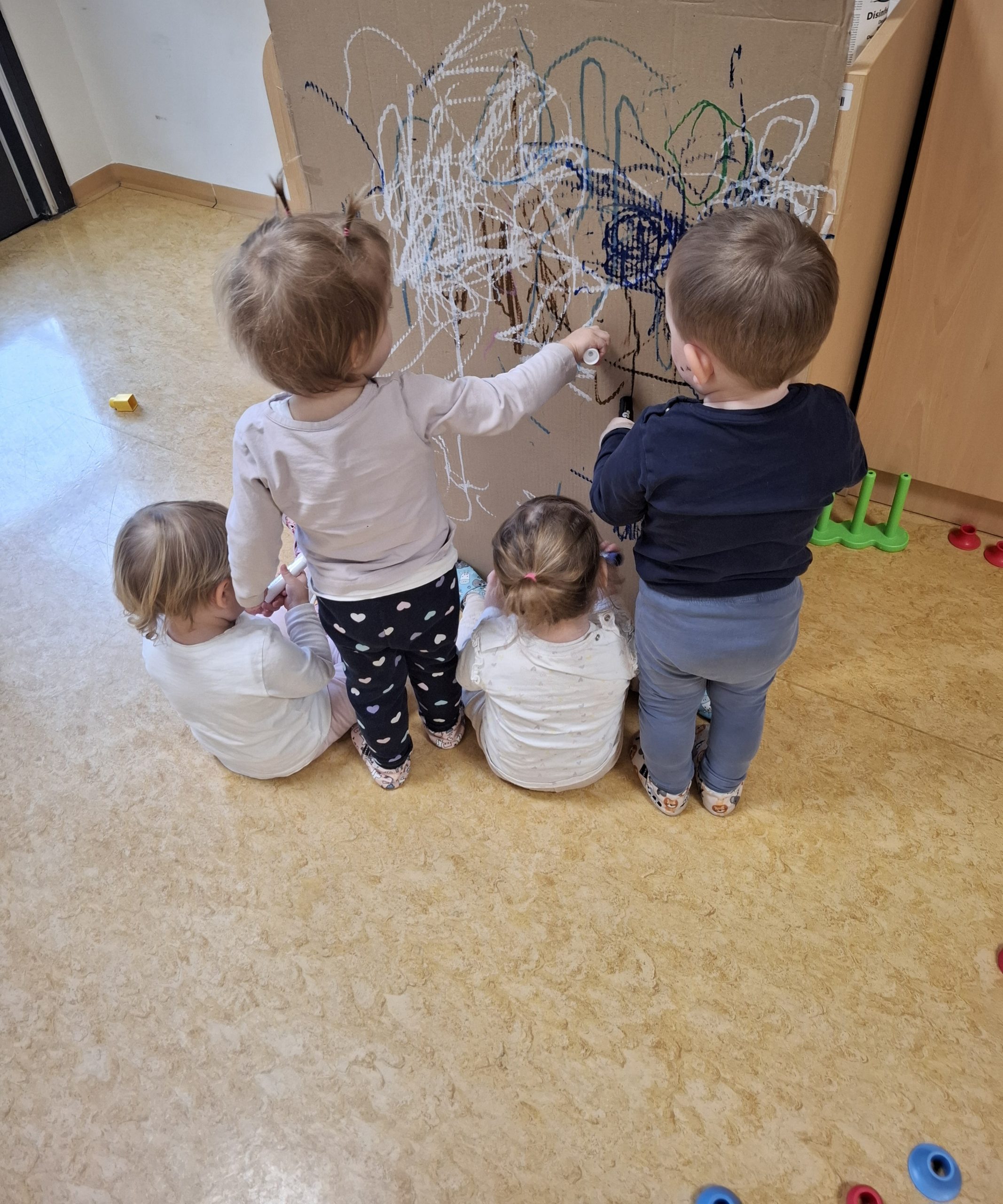 Otroci iz skupine Ježki, stari 1-2 leti, so sodelovali v likovni dejavnosti risanja z voščenkami na dveh kartonih, pri čemer je bil eden nameščen na steni, drugi pa položen na tla.
