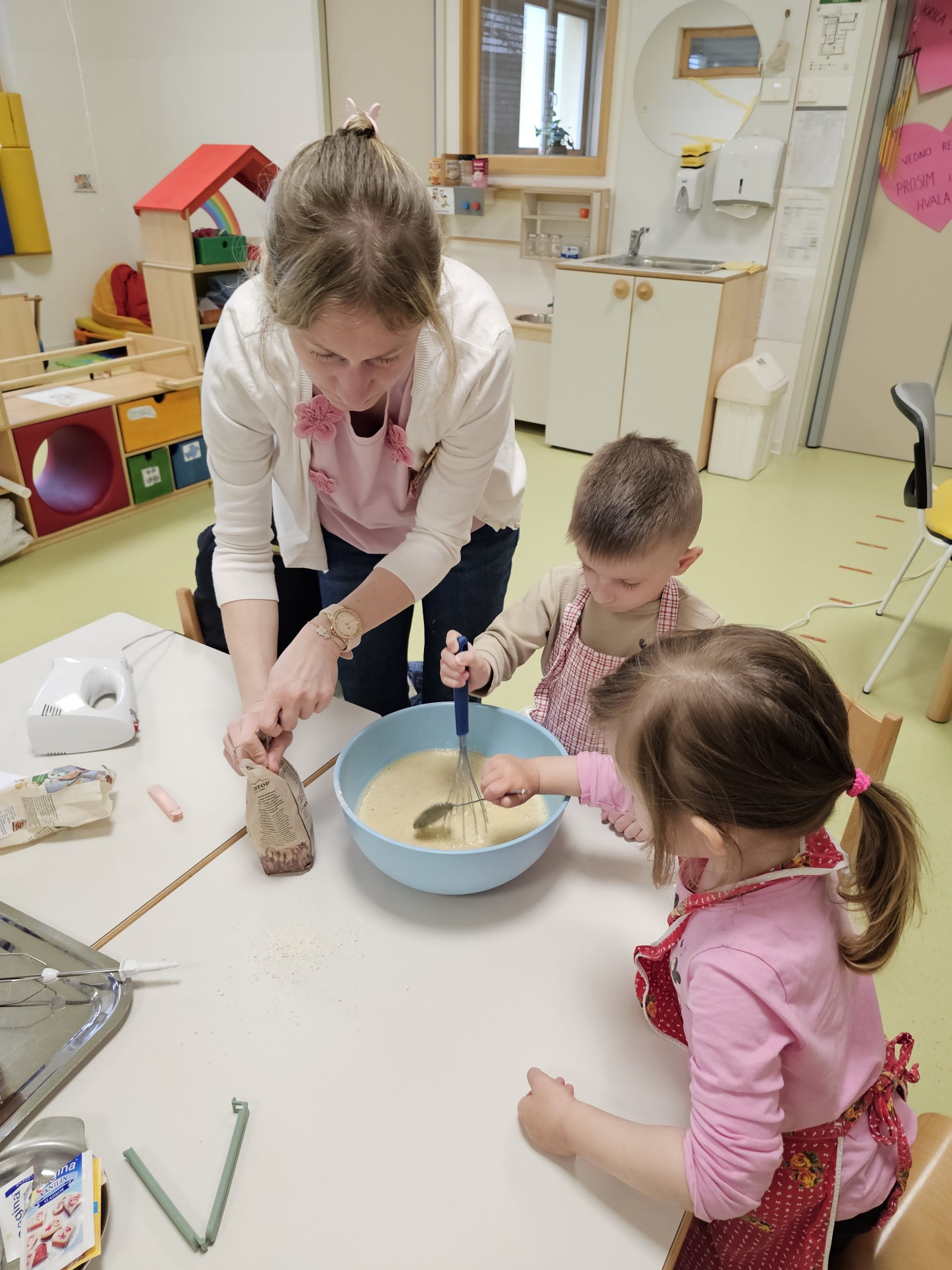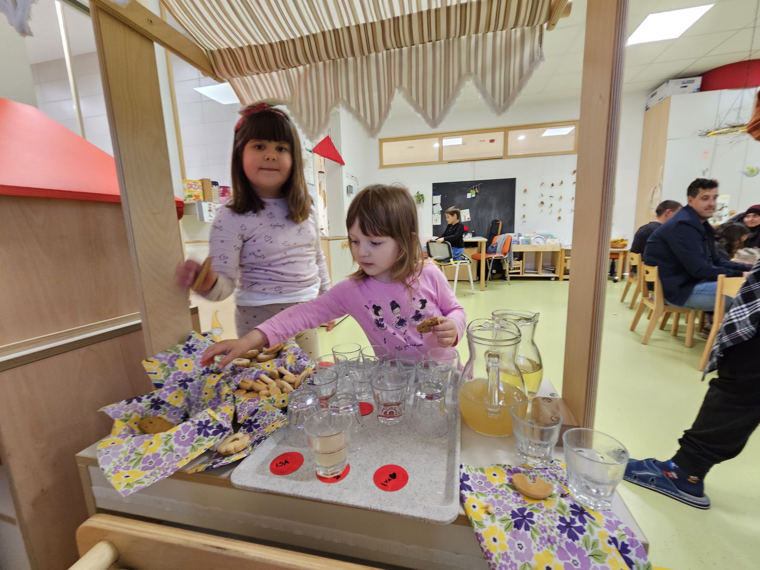 Ob ustvarjanju so nas spremljale pomladne pesmice, poskrbeli pa smo tudi za sladek kotiček s piškoti. Hišni škrati pa smo imeli tudi eno majhno skrivnost. Dopoldne smo za starše spekli slastne palačinke, a preden so starši prispeli na druženje, so jih »ptički« že pozobali. Naši mali škrati so namreč ugotovili, da so bile preprosto preveč dobre, da bi čakale do popoldneva. Ptički so kasneje le veselo začivkali, da so bile palačinke res izvrstne.