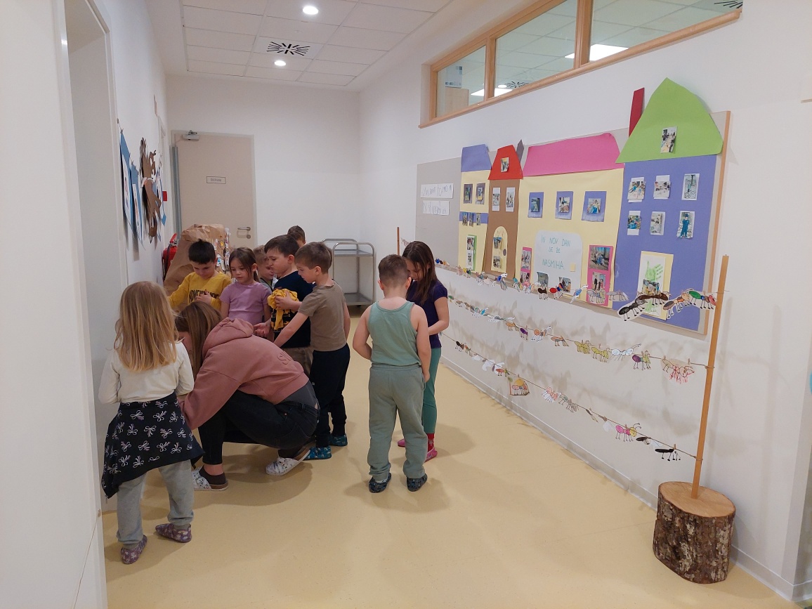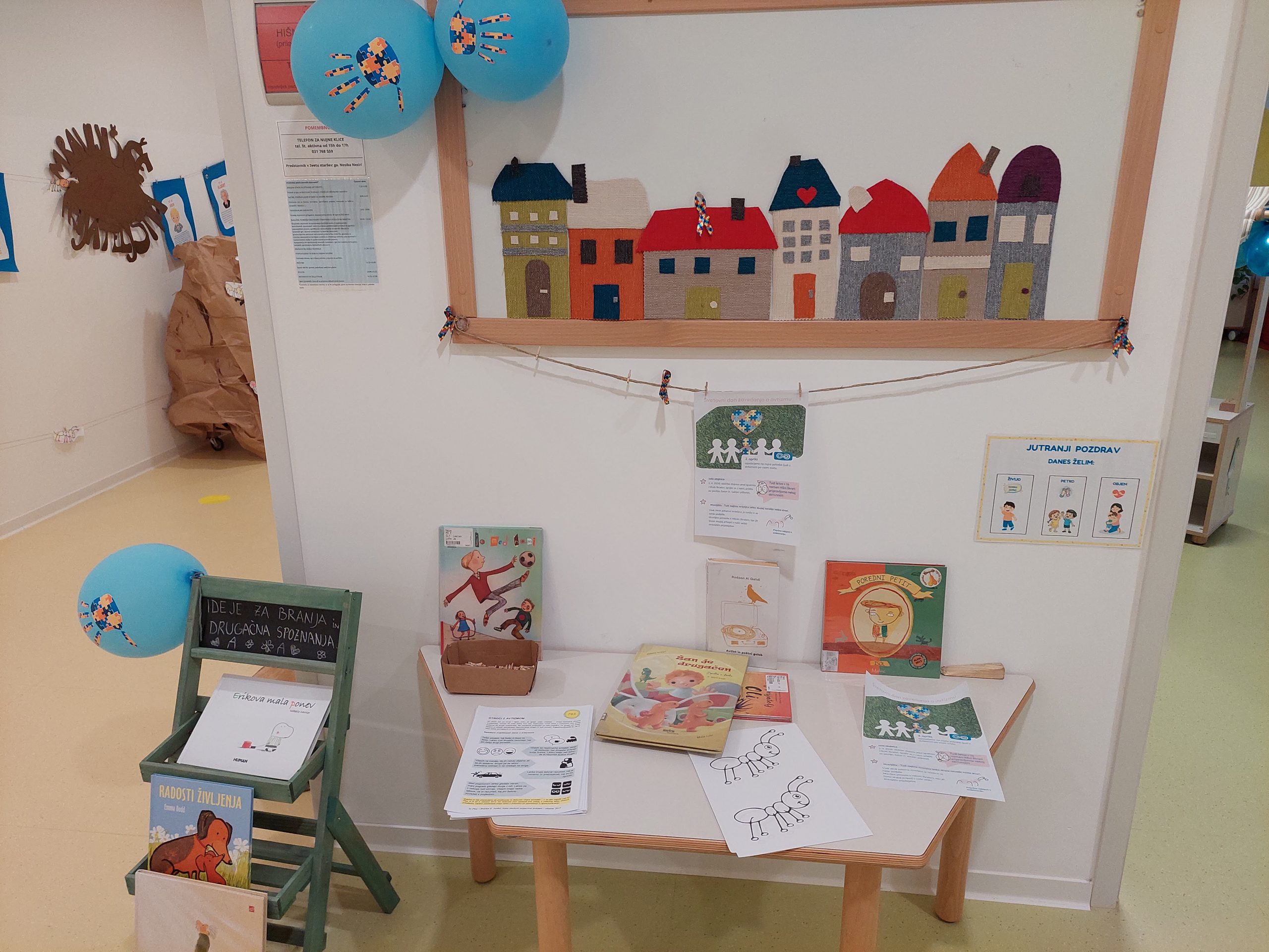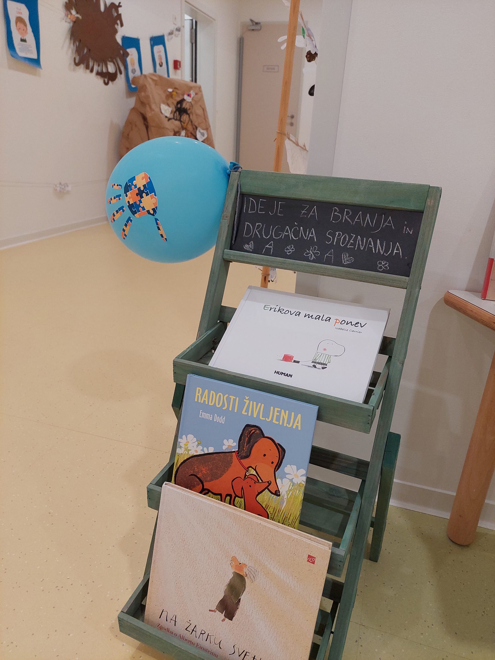 Preko pogovora so odkrivali, kaj je avtizem in kako svet doživljajo njihovi prijatelji, ki morda komunicirajo in čutijo drugače. Da bi to razumevanje prelili v dejanje, so obiskali skupino Hišni škrati (otroci v prilagojenem programu), ki se nahajajo v našem vrtcu v rdečem hodniku, kjer so jih zelo toplo sprejeli s čudovito pripravljeno stojnico in posebej urejeno polico s slikanicami, ki otrokom na prijazen način razlagajo avtizem in drugačnost.