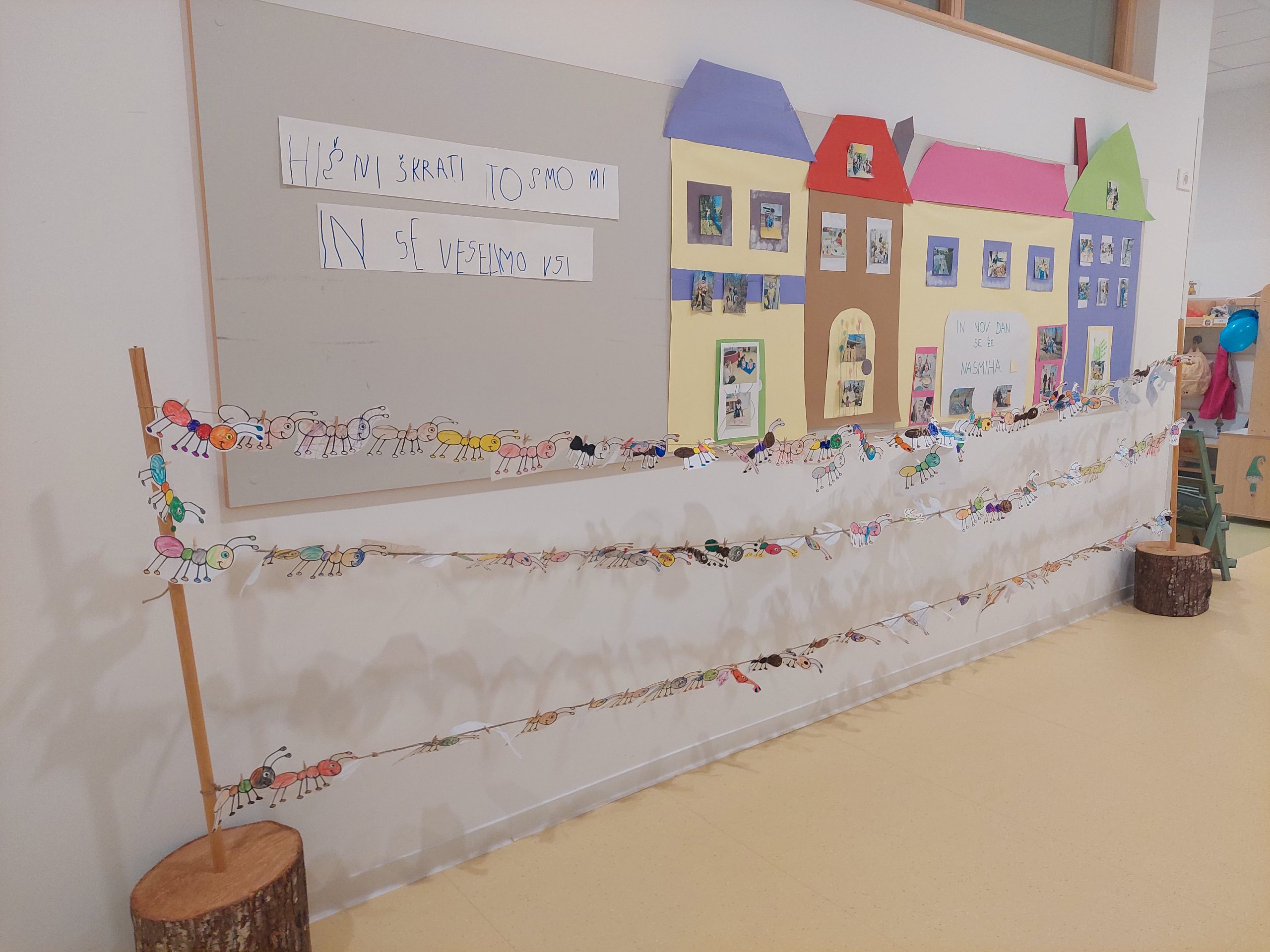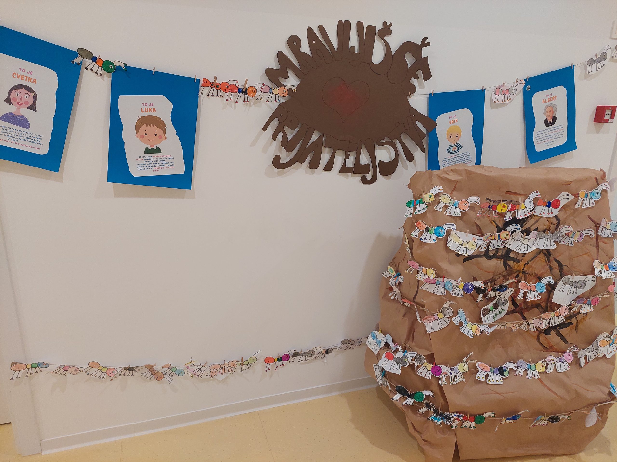 Vsak otrok je predhodno skrbno pobarval svojo mravljico. Tako so nastale pravljične, pisano-mavrične mravljice, ki so jih otroci s ščipalkami pripeli v improvizirano mravljišče. S tem smo ustvarili močen simbol – simbol povezanosti ter da prav vsaka »mravljica« prispeva svoj del k močni in srčni skupnosti. Tudi vzgojiteljice smo prejele poseben znak – priponko, ki smo ga danes ponosno nosile na svojih majicah in haljicah.